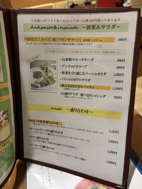 前菜はハモンセラーノ、自家製スモークチーズ、ホタテのカルパッチョにバーニャカウダ。