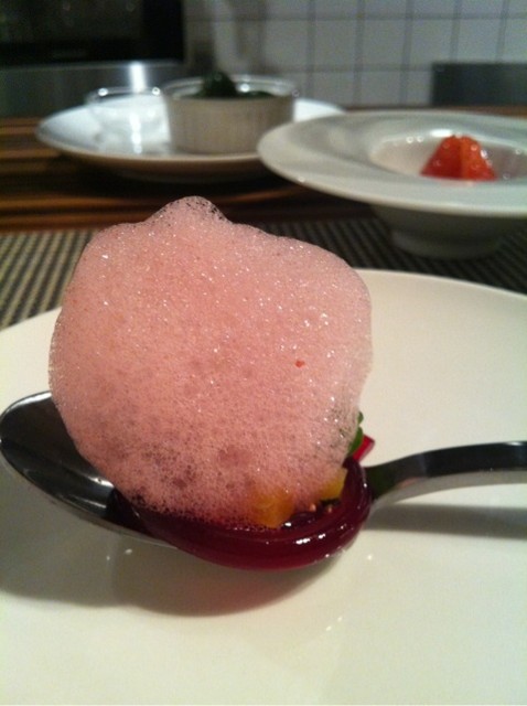 ■アミューズ:巨大な注射器をゆっくり押してください、と渡され白いお皿ににゅ~っと出すとビーツの赤いジュレが出てきます!スプーンの上にエスプーマと一緒に盛り付けていただきました♪年内で終わりというイチゴのピクルスもおねだり(*^_^*) 1月からは違うピクルスが登場するそうです。