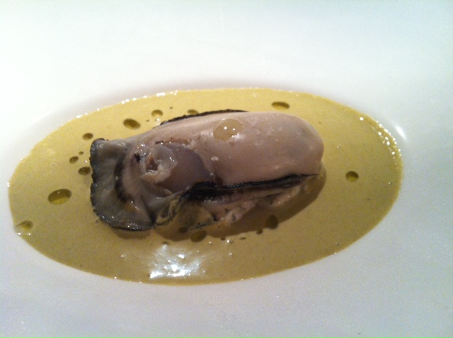 ■牡蠣の冷静スープ:牡蠣のタルタル、少し火を入れた厚岸産の大粒の牡蠣を乗せたスープ。コクがあってなんとも言えない深い味わい。