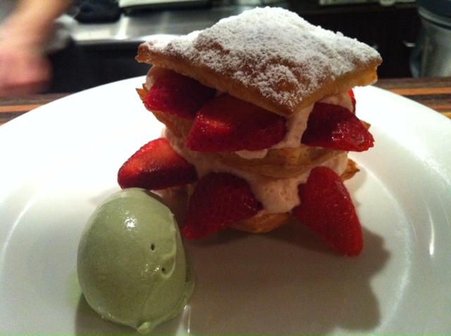 ■いちごのミルフィーユ:試行錯誤を繰り返したというパイ生地を使ったミルフィーユ。ビストロっぽくてシェフお気に入りの作品だそうです。サクサクのパイに甘さ控えめのストロベリークリーム。大量のクリームが得意でないけど、ペロリと食べられました!