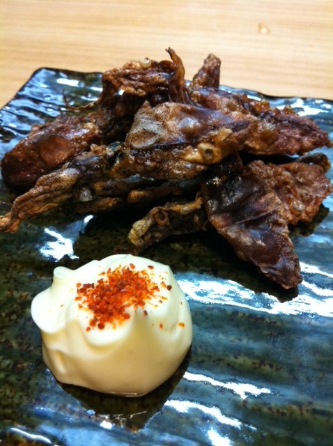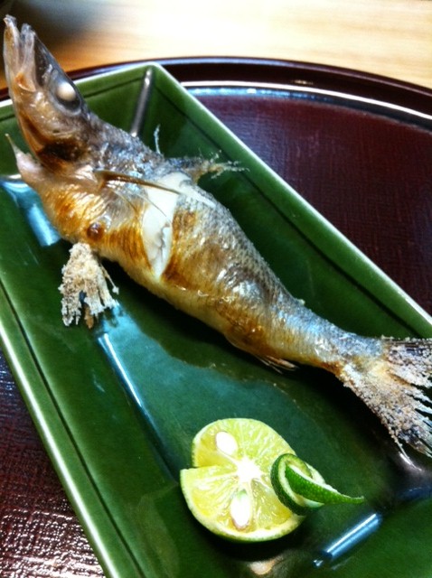 ■メヒカリの塩焼き:今日の大将のオススメはメヒカリでした。その日築地で40匹程度しか取引されていないというメヒカリが6匹も久原にいるのです!通常お店で出されるものは10cm未満のものがほとんどですが、このメヒカリ、20cmくらいはあろうかという親玉!淡白なお魚ですが、ふわふわで上品でほろほろと身がほどけていきます。