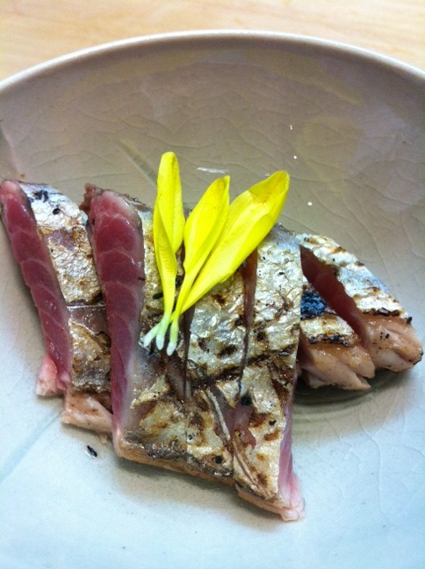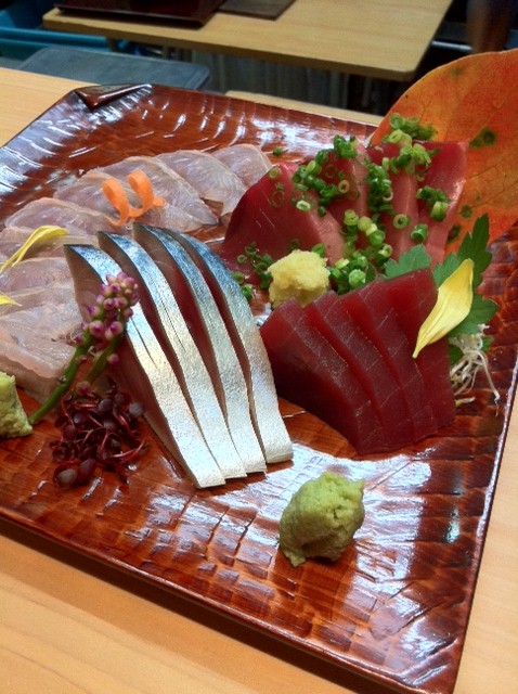 ■刺身盛合わせ(青森の平目、大間のマグロ、気仙沼の戻り鰹、静岡の松葉鯖の〆):〆鯖が非常に美味しかった。脂のノリはもちろん、〆具合が絶妙で、甘すぎず、酢がききすぎず。