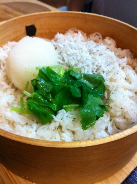 ■わっぱめし:何度も通っているのに、わっぱ飯は今日初めてオーダー。本日のわっぱはシラス。大根おろしと三つ葉を合わせて混ぜていただきます。しらすがたっぷり。お茶碗軽めで3杯分でしょうか。これをランチで食べられるなんて贅沢。