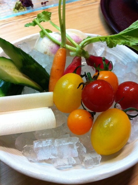 ■生野菜の盛合わせ:こだわりの産直野菜。野菜の味の濃いこと。自家製の葱味噌も美味。