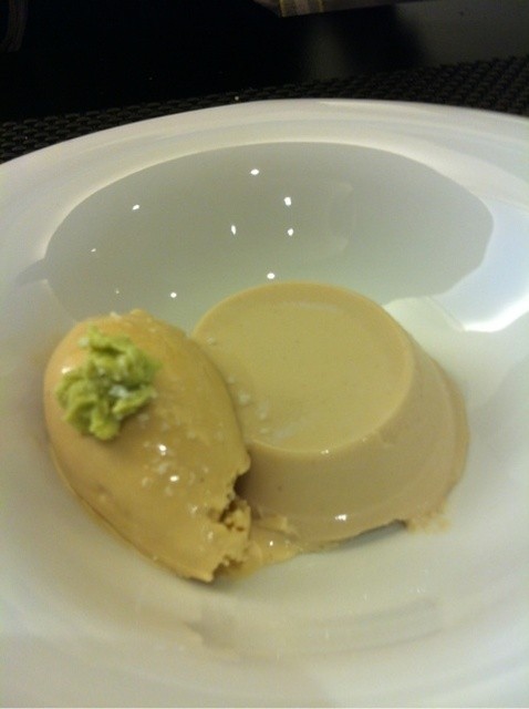 ほうじ茶のブランマンジェとアイスクリーム 本わさびとゲランドの海塩を添えて