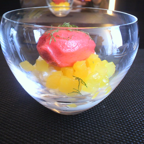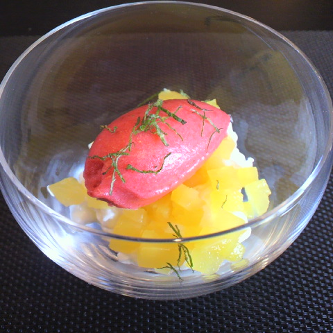 ココナッツ風味のコシヒカリのバヴァロワ、パイナップルのコンポートと苺のソルベ2