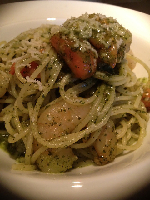 小エビと言っても甘えびクラスが5つほど、ジェノベーゼソースはもうちょっと