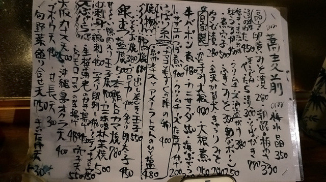 メニューは縦書で酒のアテが満載だけど見難いね(これ以外にもあり)。