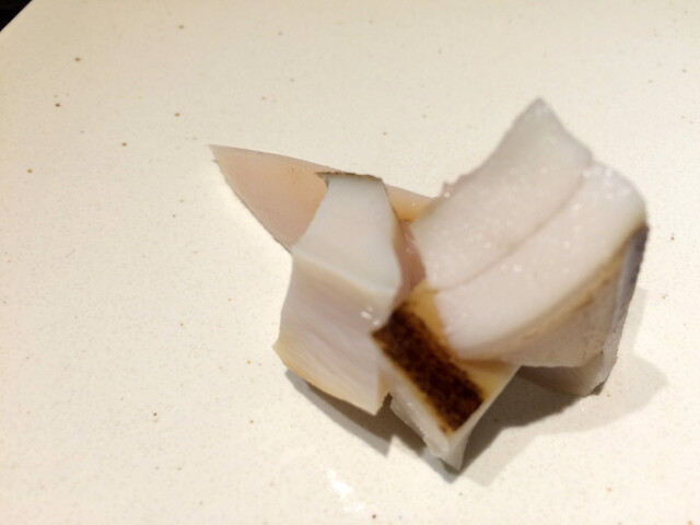 塗られた醤油は煮きり醤油、小皿の醤油は鮭ぶし、天使のエビ。