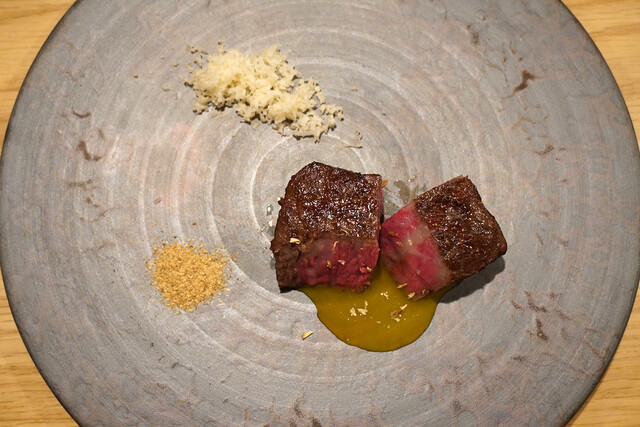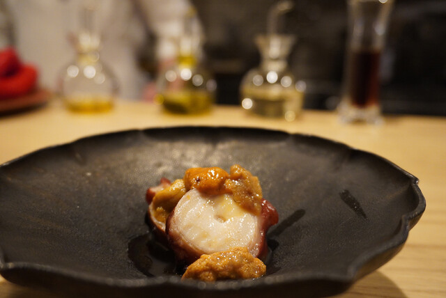 木なカウンターと設え、料理が映えるような明かり使いは、落ち着いた雰囲気で