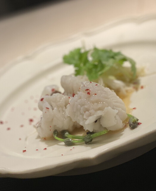 淡路 鱧の湯引き、みずのみ、白葱油掛け フリーズドライの梅掛け