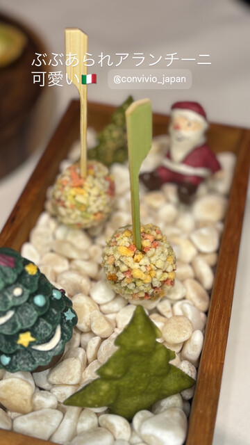 ぶぶあられを纏ったカラフルアランチーニが印象的で、美しく中もしっとり美味しい