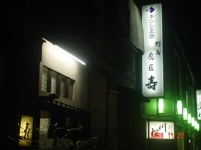 今夜のj弊主宰オフ会は、浅草の野鴨料理の老舗「鷹匠壽」で開かれました。この店は【一見お断り】ですが、宴中「恐らく並みの料理評論家より食べ歩いているし、記録も残しているから、本出せば?」と勧められた会員さまのご紹介で、実現に至りました。