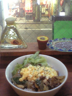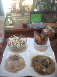 注文したのは、「ニュージーランドプレート」(ラム肉のカレー炒め、ムール貝ワイン蒸し、サーモンサラダなど)、「とろとろ卵のラムカレー」、ニュージーランド紅茶「ベル」。これで充分満腹です。味も対価価値的にそう悪くないし。写真の奥、窓の向こうにはあの壱銭洋食が!(笑)