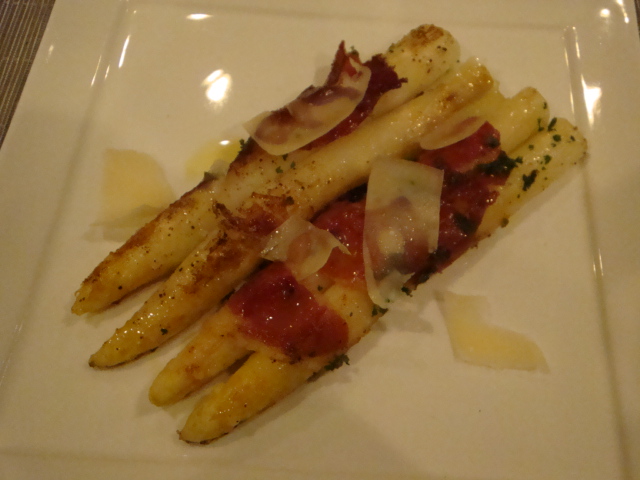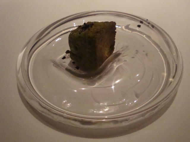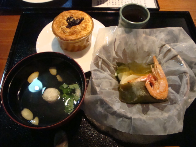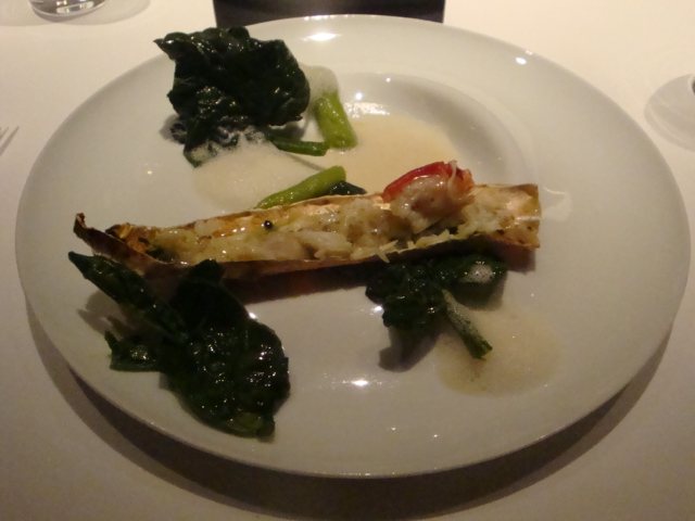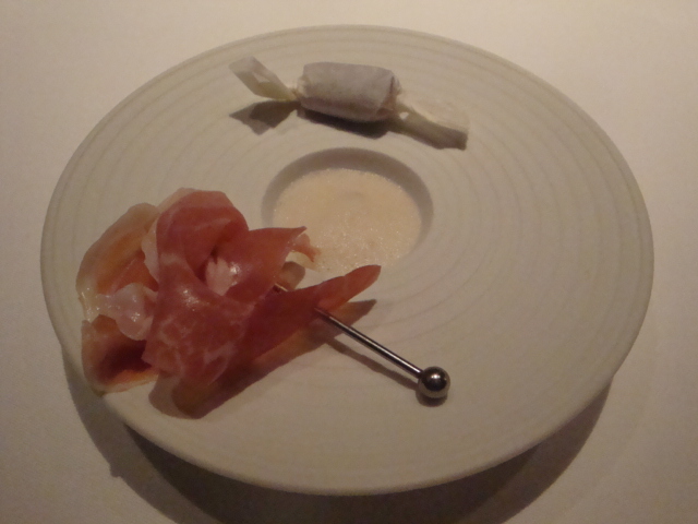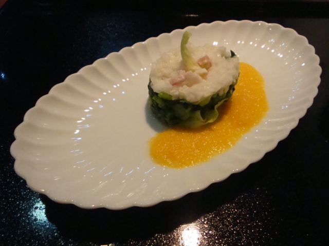前回はランチで6皿でしたが、今回はディナーなので小菓子も入れて10皿。最初の3皿は、中程度ながらそれほど関心を引きません。パルマ産生ハムなんて、いつも夜食に食っているし、【女性ウケする】フォアグラを出すフレンチも増え、食べにくさだけが強印象。タラバガニも味つけ良しですが身は少ないし何となく流行に乗っている気がします。どの皿も、他のボッタクリフレンチと比べれば勿論はるかに優れているとはいえ、ディナーでミシュラン店ともなれば、採点基準が上がるのは当然の教員目線です。