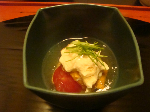 アミューズの「富士山の湧き水で育てたサーモンと松輪のカンパチのマリネ ミディトマト「越のルビー」を添えて」は、トマトとサーモンと来るとどうしてもトマトの酸味が勝ってサーモンの持ち味を消してしまうのですが、両方の魚の地味もしっかり味わえて好感。最近は濃い味や激辛の方が世間では好かれていますが、香辛料は主張無く食材の持ち味を引き出す形が好みの筆者。さっぱりした皿は次への導入として最適でした。
