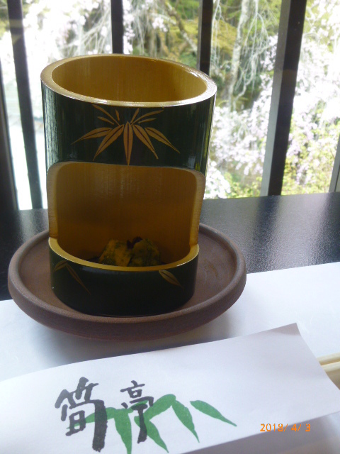 料理は身の程を弁えてランチの「筍懐石」にしたけど、筍のお造りを追加。これが一皿2000円くらいだったようです。なんせ筍の最高ブランド塚原産の白子ですから、妥当なところでしょう。窓外の桜がちょうど満開で、筍料理の良い<゜)))彡となりました。