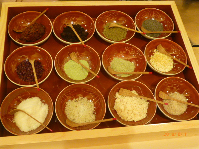 しゃぶしゃぶの出汁は秘伝(笑)のようですが、出汁の濃さがちょうど良く、豚肉の持ち味を引き立てるから美味しい。この出汁で充分しゃぶしゃぶがいけるのに、味を変えるための塩が12種類用意され、6種選択。トリュフ塩・柚子塩など、よくこれだけ揃えたと感心。これでは味を変えるために肉をおかわりしてしまうでしょう。