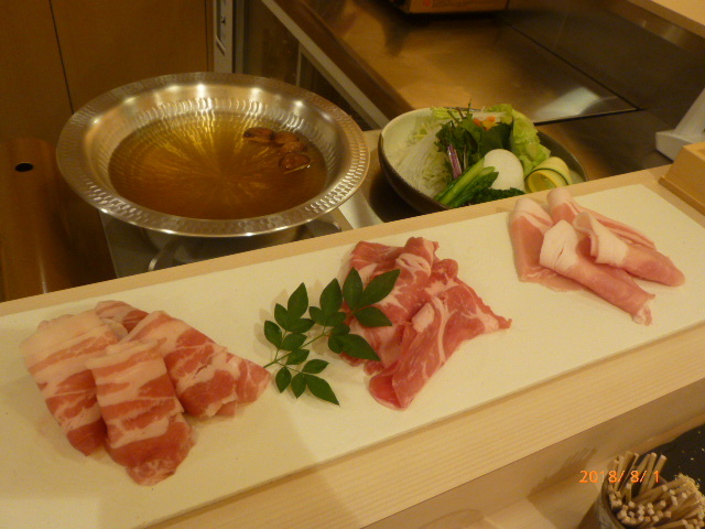 店は金春通りを入ってすぐのビル7階。地下には春に訪ねた会員制フレンチもあります。新橋駅から近くで分かりやすい。寿司屋を居抜きにして今週開店したそうで、つやつやに磨かれた壁やカウンターが目をひきます。鹿児島黒豚しゃぶしゃぶのコースが2つ、しゃぶしゃぶは店員が作って出してくれるのが嬉しい。今夜は店主が開店の話などをしながら全て作ってくれました。