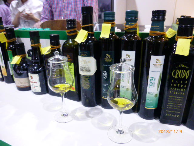 店主は従来から、筆者の京都滞在中にもやってきて、「徳山鮓」で発酵食品を学び、「比良山荘」で郷土料理の生かし方を学ぶなど、常に向上心をもち研究熱心でした。そうした経験からオリーブオイルに目をつけたのでしょう。オリーブオイルを工夫するだけなら他店にも類例があるとはいえ、店内に入ると、店主が日本オリーブオイルソムリエ協会会長の指南を受けて一緒に飲み比べてランク付けしたオリーブオイルがずらりと数十種類並び、早速ティスティングを試されました。店内全てのオリーブオイルをグレード分けし、コースの種類や料理の種類に従って合わせていくそうで、軌道に乗ったらイタリア料理の一分野としての部ランディングをかち得られる店となりそうです。