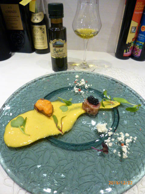 さてメイン。アワビはやわらかくウニとも良く合って美味しい。ロバ肉は、低温調理ではないけど火入れが良いのか硬さがちょうど良くて美味しかった。鴨は当初予定のスペイン産がハンガリー産マグレカナルの胸肉ローストに差し替えられ、これがあの(フォアグラを作る)鴨!と出来ばえを堪能。オリーブオイルは「2018年ダブル金賞受賞」というピエモンテ産のものでした。