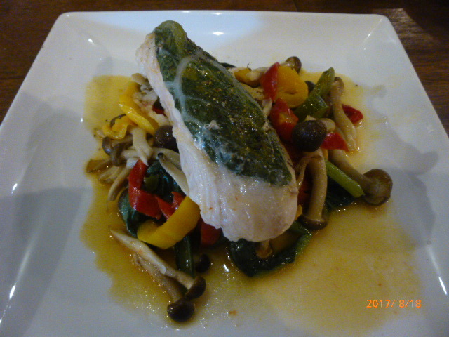 3皿目も当てられず、スケトウダラのサンドイッチだと聞いて、この先にいったい何が出て来るのか?皆さん期待がふくらみます。そういう意味では、珍食や怪しい食材が出なかったのはむしろ予想外でした。4皿目は、滋賀県産鶏肉の豚網脂巻き蒸し焼きにキノコなどの温野菜。鶏や豚の味や脂がキノコにも良い影響を与えていて、また変わった味わいでした。メインには、「ラム肉のローストにソーセージをレモンとトマトのソースで、エリンギとポテト添え」。存在感を主張しながらも肉の地味を邪魔していないソースの出来栄えが皆に称賛されました。