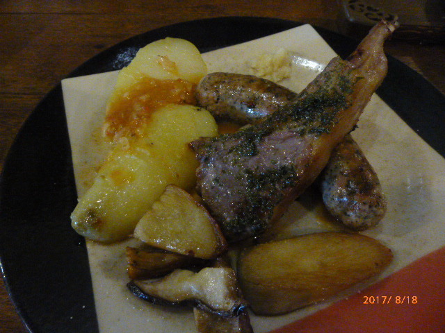 ラム肉のローストとソーセージにレモンとトマトのソース、エリンギとポテト添え