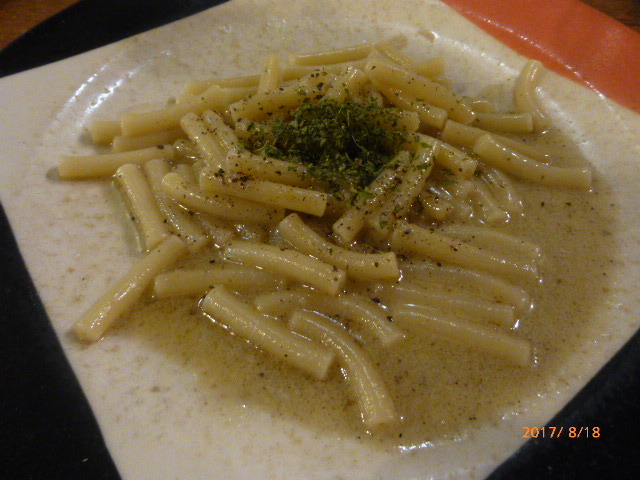 「まだ食べられます?」と聞かれ全員「もちろん!」と答えると、店主はやはり予想していたのか?パスタを作り始めます。できあがったのは、ブルーチーズが濃厚なマカロニ。といっても臭すぎたりはせず、単にクセが強い味つけ。でも参会者は皆、珍食に関しては歴食の猛者たちばかり。さらりと平らげました。