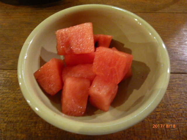 デザートにスイカが出されたので、旬だねぇ、と口に入れると、レモンの味。レモンで下ごしらえしたスイカだそうです。最後まで「仕込み」を怠らない店主の熱意に一同改めて感心しました。