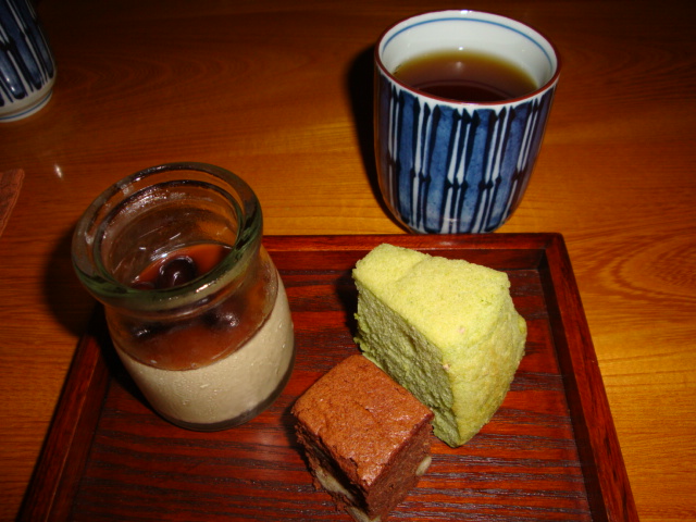 黒豆と豆乳のプリン、エゴマと豆乳のシフォンケーキ、ガトーショコラ、黒豆茶