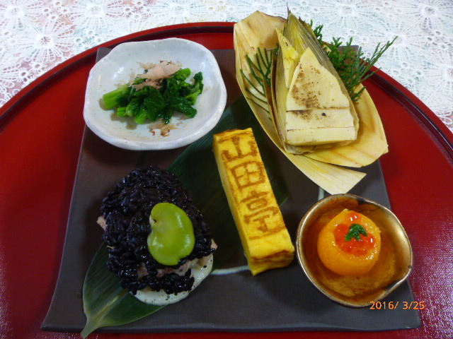 焼物 梶木鮪の西京古代米焼に厚焼玉子・建長寺産筍・金柑・菜の花