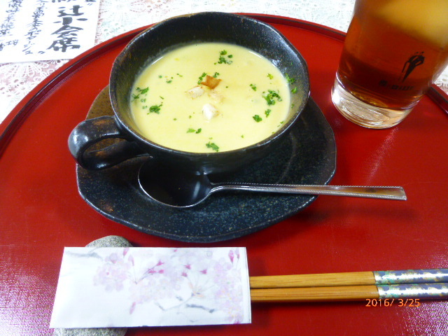 前菜 貝柱と枝豆入り玉蜀黍のポタージュ