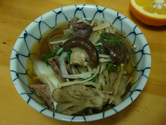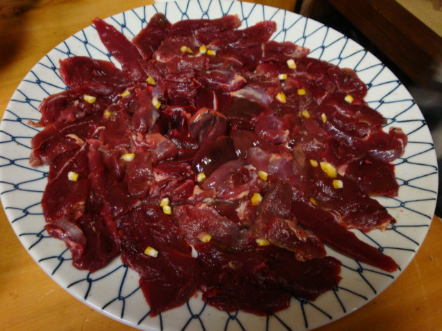 野鴨鍋(マガモ肉の心臓と砂肝の拡大)