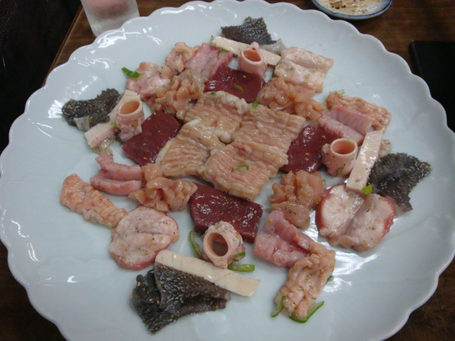 その主治医によると、彼の親の代から営業していたとかで、実は結構老舗なんですね。昔からホルモンや霜降を主に、店名通り脂濃くスタミナつくメニューを提供していたそうです。で出るわ、出るわ、一皿ごとに感動でした。特に「麤皮と同じ肉」と言われる“特選特上ロース”はもちろん裏メニューどころか表にも裏にもない特別供出品。もうメニュー名は勝手に付けてます。肩ロースでもですが、肉の切り方が違う。これだけ厚く切ってもらえると、食べた気がします。普通は雑然と山盛りのところ、撮影用に美しく盛り付けしてくれた「ミックスホルモン」も、各部位全て説明を頂きました(忘れたけど)。