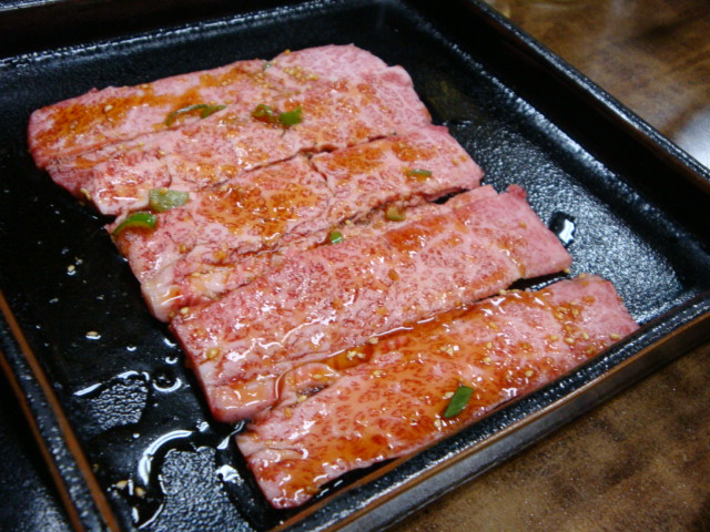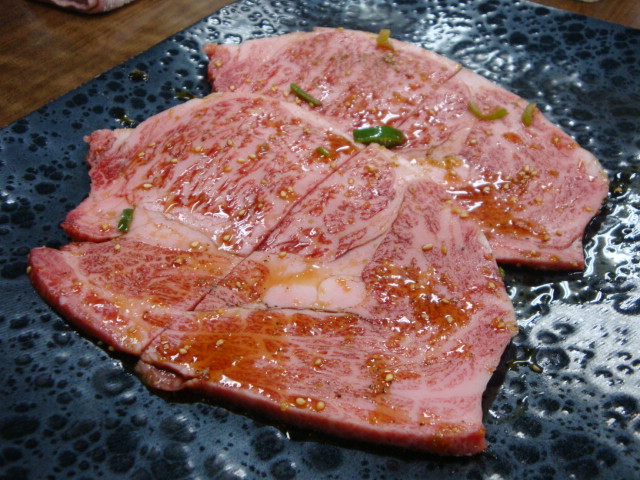 まず出された上タン塩と特上ハラミ。肉厚で事前「仕込み」で味つけがよく練られているだけでなく、肉ひと切れごとに隠し包丁が入っていたり、よく「仕事」されています。聞けば、我々の肉を準備するたびに朝の5時まで仕込みに時間をかけたとかで、たとえ肉を自分で焼いたとしても、ここまで手間ひまかけられると立派な「料理」。他店とは違う肉の味わいの由縁です。