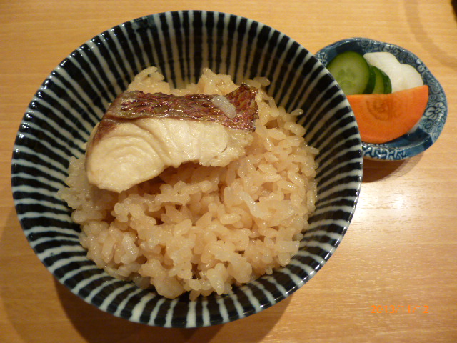 鯛の炊き込みご飯、なめこの赤だし、お新香
