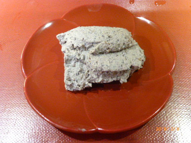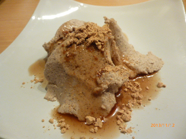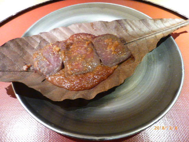 肉皿は黒毛牛の朴葉焼き。朴葉焼きって、メインで使う料理なのに、惜しげもなくアテ皿で使う大胆さ。葉の上のや来た味噌をつまみながら、「ご飯がほしい」と皆さんつぶやいていました。そんな飯物は、久々の茶漬けに皆狂喜。今回はヒラメの胡麻和え茶漬け。この店の茶漬けは定評がありましたが、一部の客の心無い批判が店主の耳に入ってから暫く封印されていました。「今後も、お茶漬けが出てほしい」と参加者たちも声を揃えていました。黒ゴマのムースで締め。
