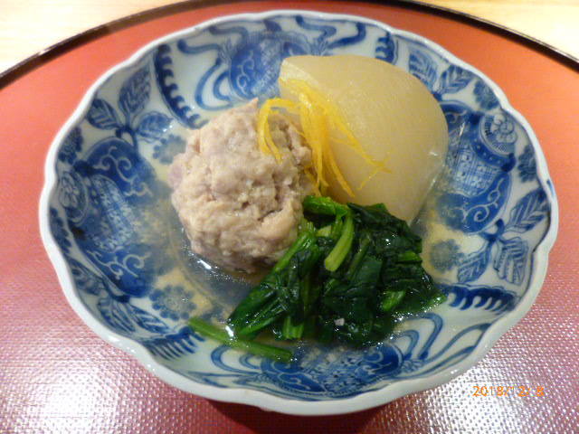 今回は、先付の真鱈の白子でテンション上がり、続く椀物のズワイガニ真丈は肝と身がかなり多く練り込まれて食べでがあり、厚い椎茸も美味しかった。お造りの後の焚き合わせは、淀大根の熱加減が絶妙。ほくほくにほぐれる食感は「あざぶ一期」「ちょうちん」などのおでんの名店も及びがつかぬほど。よくここまで煮込んだものよ!その割には味が濃くならぬ出来ばえに賛辞を惜しみませんでした。