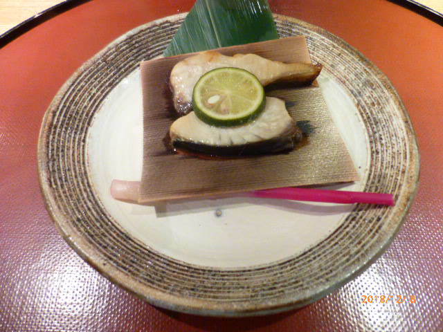 焼物の鰆の杉板焼きに続く揚物が、今月店主試作の新メニュー「雲丹衣上げ」。天かすにウニを練り込んで揚げるという趣向です。今回は海老芋と平貝でしたが、海老芋に挑戦するあたりは「天ぷら近藤」に照準を定めたのか?と思わせるほど。美味しかったです。次に、金目鯛と九条葱の茶碗蒸しに生姜風味の餡かけ。寒い夜に嬉しい生姜風味ですが、茶椀蒸しにしては九条葱がめちゃめちゃ多く、食べごたえがありました。