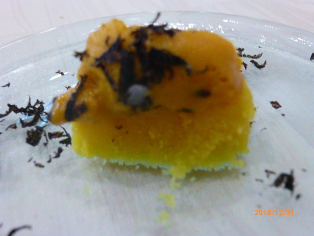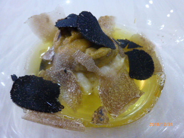 続いて、白子のフリットにマルケ産白トリュフと神奈川県産黒トリュフにサフランのスープ。白子が本当に揚げてある! 衣が薄くて分かりませんでした。こんなによく薄く揚げられるものよと感心。この白子を崩しながら、白い方♪黒い方♪に絡めて食べるのも美味しい。