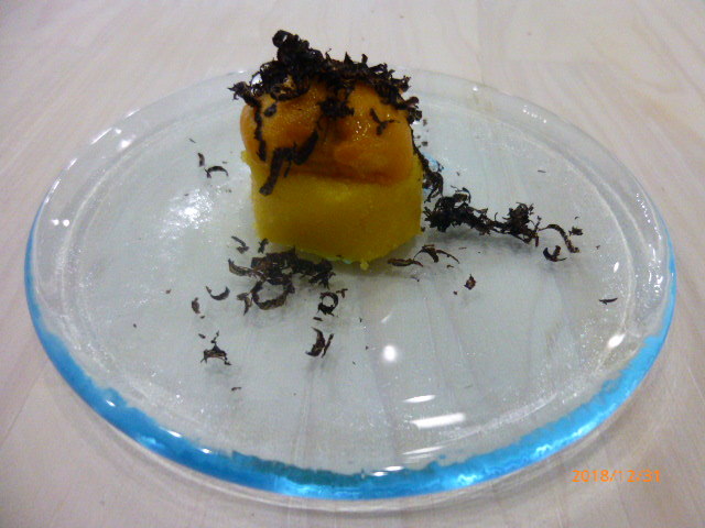 本鮪とウニとキャビア、キャロットソースとオリーブオイルパウダー