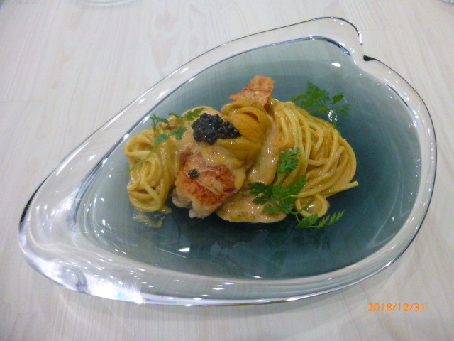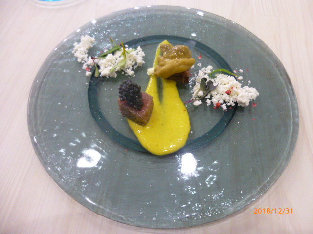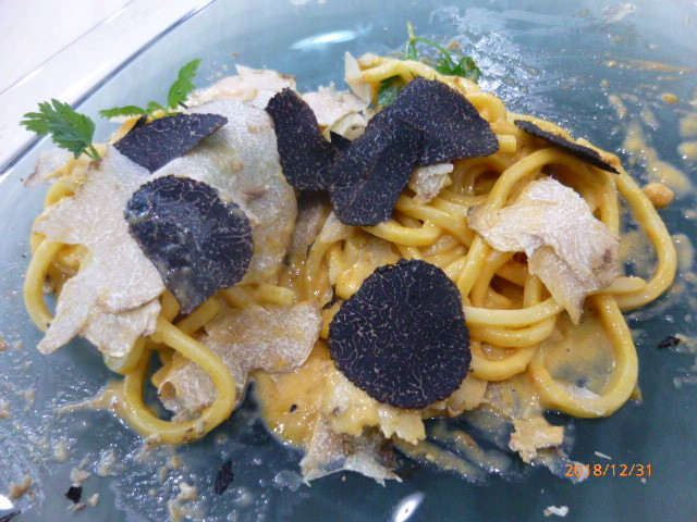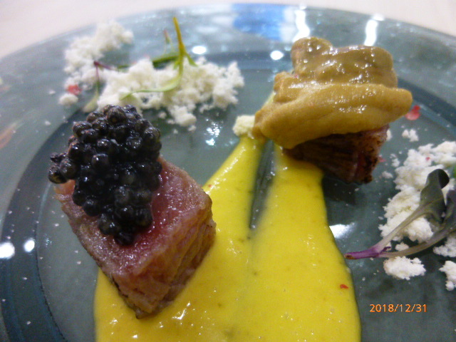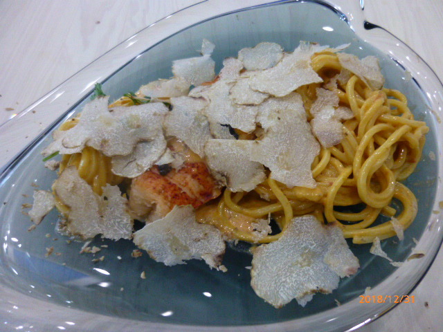 パスタには、ウニとキャビアとオマール海老のパスタ。オマール海老を三日ほど煮込んだ出汁を使って麺に味付け、ウニも絡めています。ウニを使ったパスタや肉は最近急増していますが、ウニ独特の酸味や苦味がパスタと合わないことが多く、他ではウニのパスタを自分から注文することは最近なくなりました。でも、今夜のウニのパスタは、ウニの持ち味の主張が弱くてかえてパスタとのバランスが取れている。添えられたオマール海老は低温調理だそうですが、身が大ぶりで柔らかく、ガッツリ味わえました。さらに、オーナーが来て、「今夜大晦日だし~ サービス!」と白トリュフと黒トリュフを交互に削る!削る!www パスタがトリュフにすっかり埋もれてしまいましたよ。他店でこんなにトリュフ削られたら、何万取られるんだろう?(^_^;)