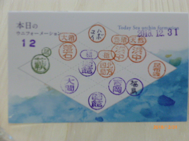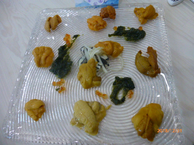 さていよいよ、ウニ食べ比べ。今回は12種のウニが出されましたが、在庫は常に30種前後あるそうです。ホント?と疑ったわけではないけど、他の外国人客たちに乗せられたのか?食後にオーナーが全在庫ウニを並べさせて撮影タイム♪ 他の客達は、ウニとオーナーとシェフとで記念撮影して楽しんでいました。筆者はウニだけ撮影。ちゃんと説明カードが添えられ、これが会員カードになっており、ポイントが溜まると「ウニ検定」を受験、ブラインドテストなどで「合格」すると「ウニ・マイスター」となり、さらにランクアップとともに特典が増す仕組みだそうです。最近多いですね。でも射幸心をくすぐられます。札幌出張の折、各地の銘柄牛を食べ比べてブラインドテストで当てるというコンテストに、飛び入り参加して、松阪牛・米沢牛・飛騨牛・十勝牛を筆者が食べ当てて「肉のソムリエ」の称号を授かった十年ほど前を思い出します。さすがに今夜、ウニを食べ当てるのは難しかったけど、オーナー曰く、「何度か来店されて召し上がれば、分かるようになりますよ」 そうでしょうねwww