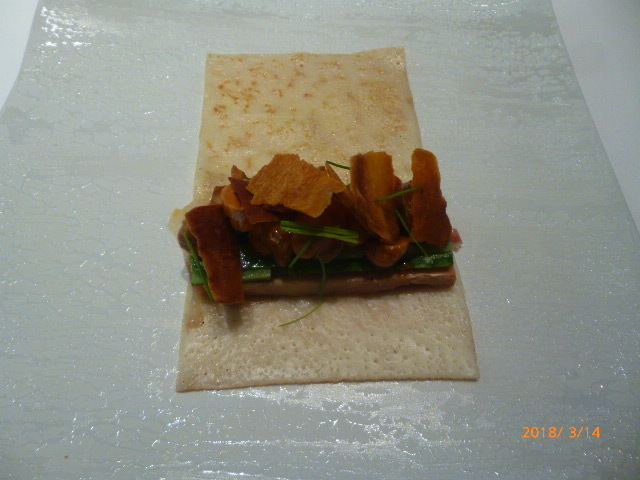 次の「冷製フォアグラにイベリコ豚のハムでクレープ包み」。あの「魔法のフォアグラ」に匹敵するのはこの店のフォアグラくらい。ただ今回、ナッツやハムなど「との相性が絶妙で素晴らしいわ」と無批判に感動している同席者達とは違って、筆者は、フォアグラだけで充分美味しいのにと感じました。「マリアージュ」は相性が難しい、料理も男女も、、、