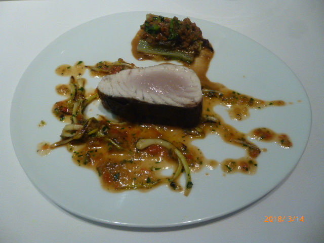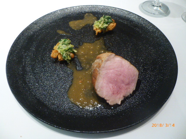 魚料理は徳島産鰆をレアで。この厚みがいいですね。内部のレア感も美味しい。この後の肉料理がイマイチ(といっても、コース内での比較で)だったので、この魚料理は一層美味しく感じました。