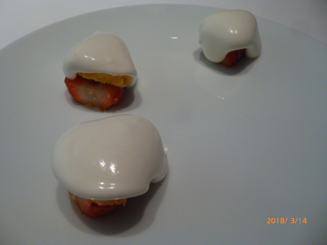 デザートその1は、「シェフのショートケーキ」。とちおとめを使った創意豊かな発想が、、、吉と出るか?凶と出るか?は主観的判断もあって運命が分かれますが、これは肯定的に受容できました。やはり昼ディナーは少食な筆者には重いので、軽いものに好意的になるのでしょう。続く「焼き立てパイナップルのタルトとマスカルポーネのアイスクリーム」がやや重く感じたくらい。