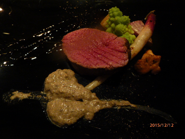 今夜の「メイン」は白トリュフなのでそれほど期待していなかった今夜の「メイン」の皿は、「蝦夷鹿と白トリュフのソース、岐阜産日野菜カブ・紫大根・トピナンブール・ピエドムートンの付け合わせ」。昨年の「トスカナ地方シエナ産チンタセネーゼ豚の肩ロースにアルバ産白トリュフかけ」に比べて肉の量が歴然と違い、肉の量はやや減ったけど、白トリュフの種類が増えたので、良しとしましょう。