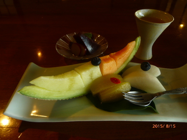 三宝柑のジュース、メロン、赤身メロン、ゴールデンキーウイ、梨、羊羹