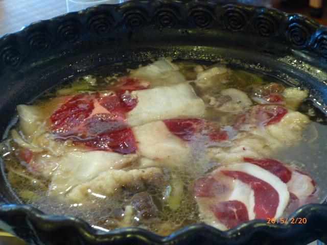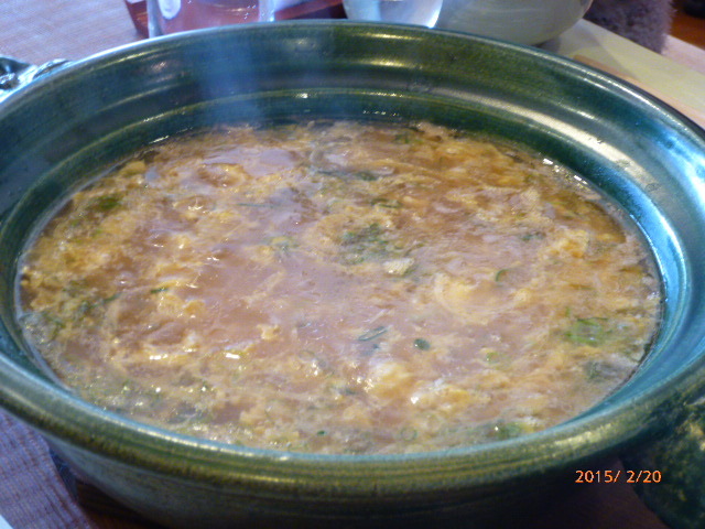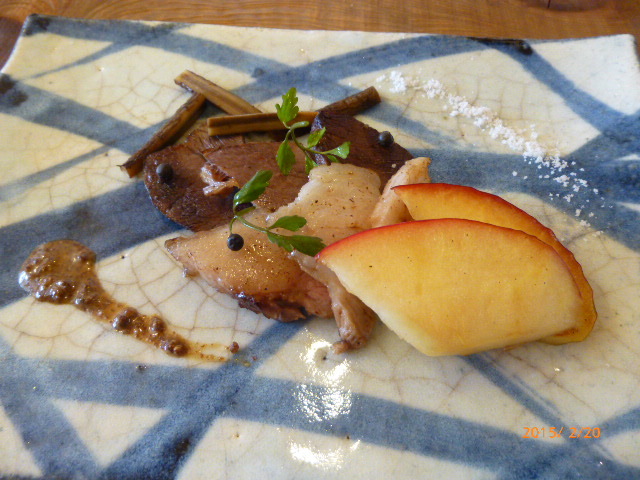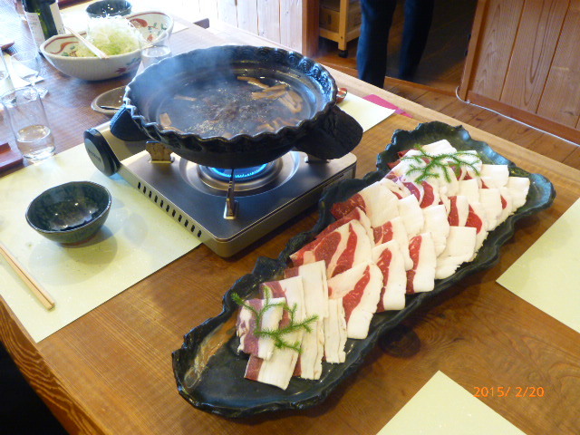 料理は「月鍋コース」。裏の山で獲れた熊の肉を中心とした鍋です。昼から「ジビエ」なんて、重いじゃん!と思いつつ、さらに、野生の熊の分際で肉にはたっぷり脂が付いているにも関わらず、そんなにもたれなかった不思議。