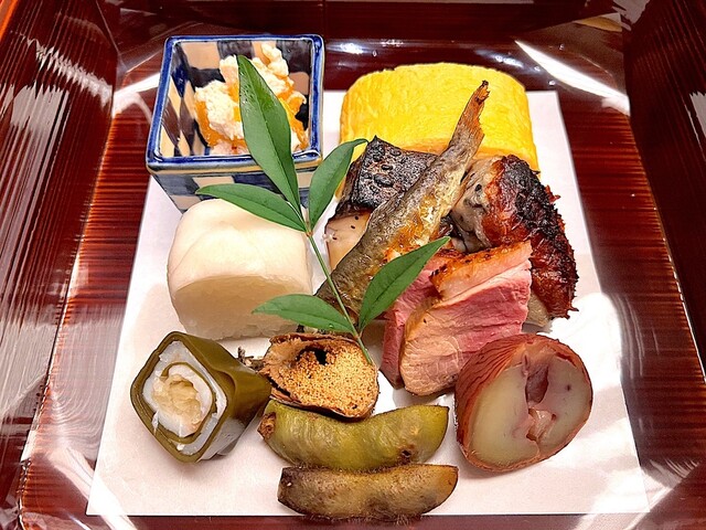 胡麻麩の田楽、あまごの南蛮、鯛の求肥巻、鴨ロース、栗の渋皮に、鰆炭焼き、枝豆、千枚漬けのお寿司、だし巻きたまご、柿の白和えなど・・・。(まちがってるかも)